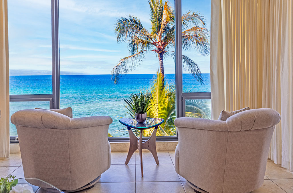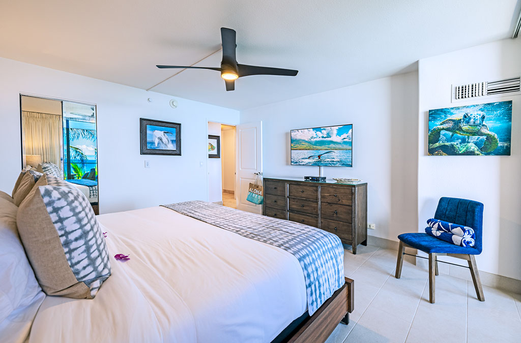 Mahana #508 is located on the 5th floor which is ideal for views–not being too high and getting disconnected from the beach or too low and having palm trees block the view. This residence was just recently purchased in 2021 and the new owners have done an elegant job of reinvigorating the space throughout. Handsome blue furniture brings the stunning exterior surroundings into the home rather than overwhelming the space with dark and heavy furniture. Think bright, airy, and fun.
