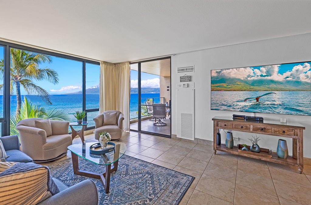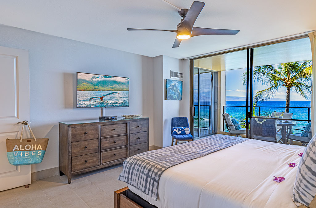 Vacation life at Mahana #508 is simply the best, direct oceanfront living with uncompromising views of the ocean, the golden sandy shores of North Kaanapali Beach below and commanding views of the islands of Lanai and Molokai. You will experience year-round sunsets and the best seats in the house for Maui’s favorite spectator sport: Humpback whale watching either from the lanai or via the floor to ceiling glass windows in both rooms. Watch swaying palm trees and hear the waves lapping the shore. Rest properly on a brand new Tempur-Pedic King bed with 550 count soft, clean, white cotton linens as the sounds of the ocean lull you to sleep and keep cool thanks to a very effective Central A/C.
